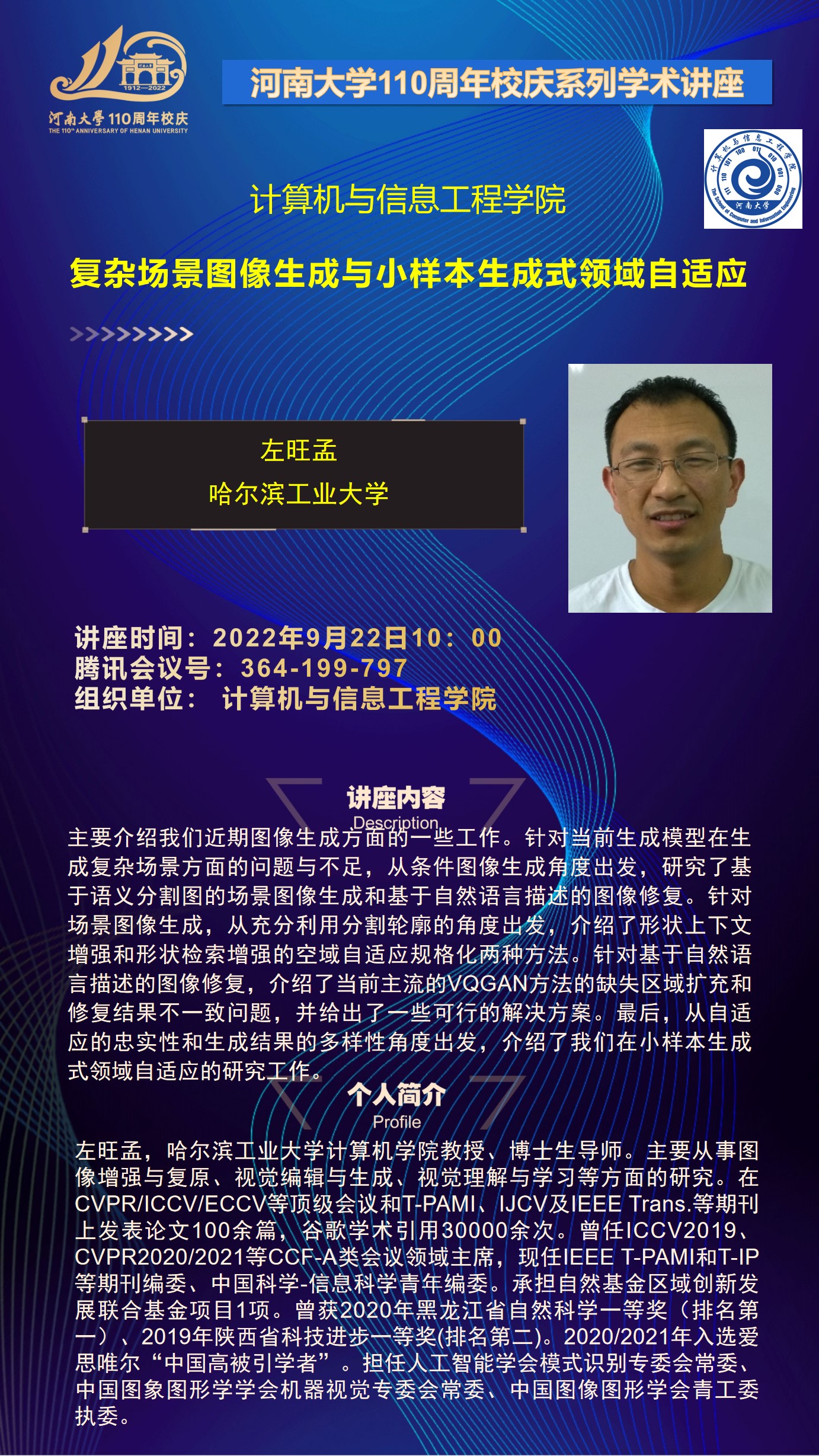 校庆学术活动:左旺孟:复杂场景图像生成与小样本生成式领域自适应(时间9.22)