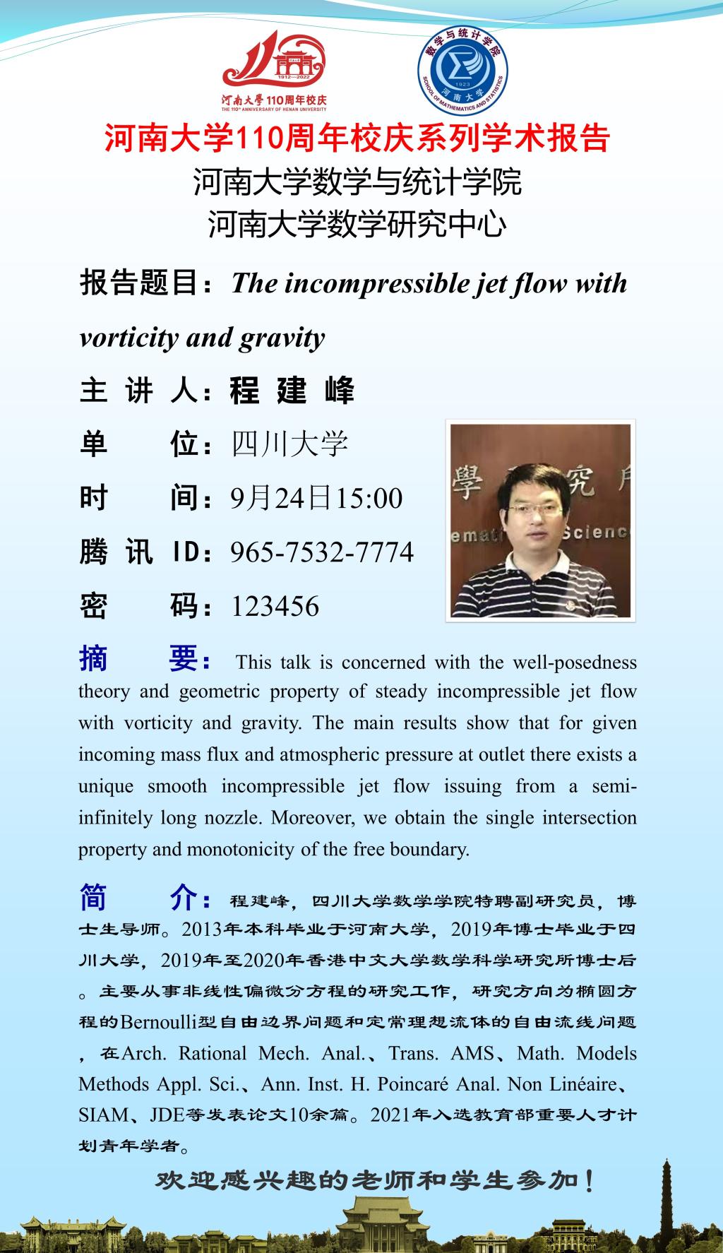 校庆学术活动:程建峰:The incompressible jet flow with vorticity and gravity(9.24)