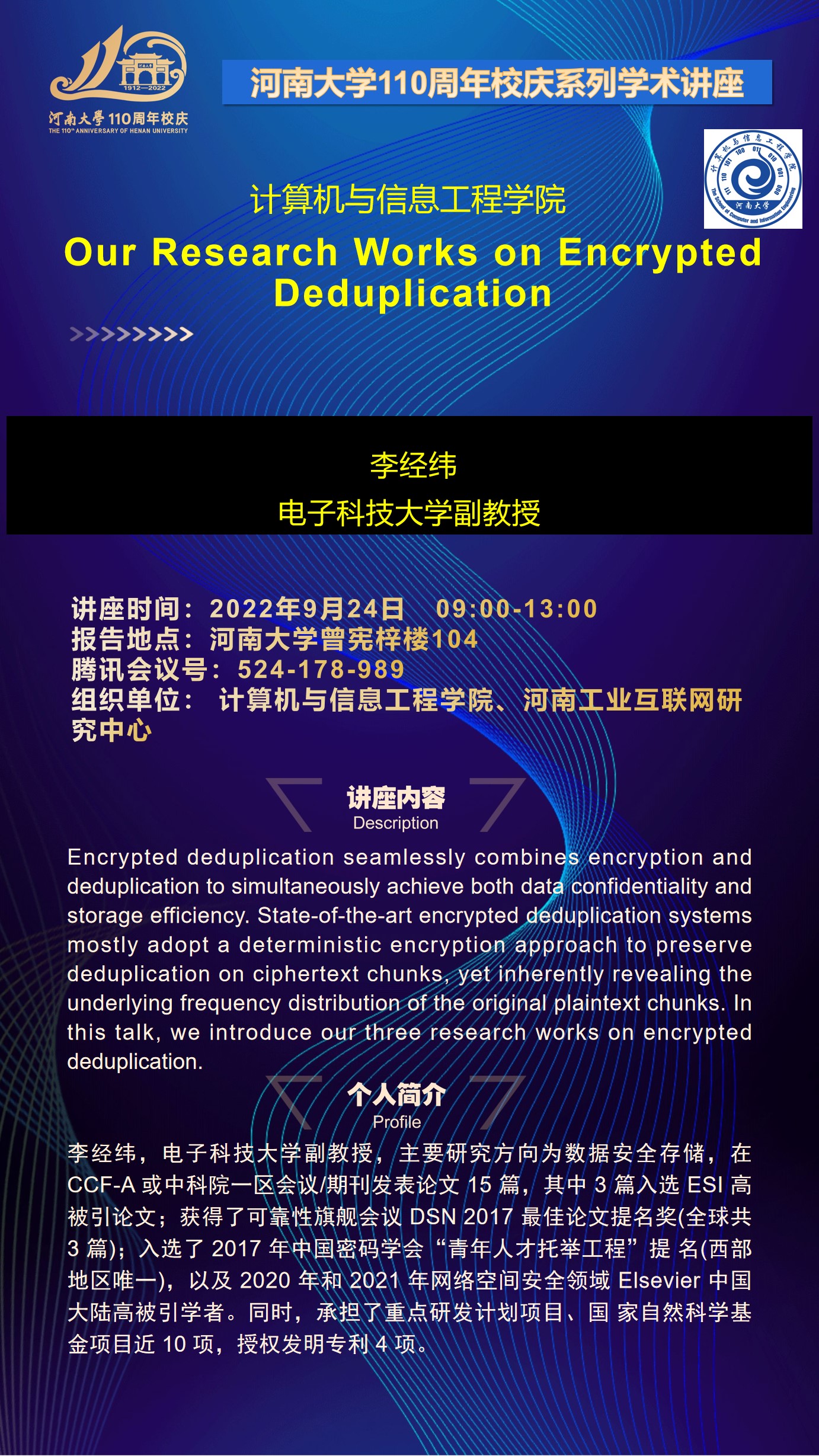校庆学术活动:Our Research Works on Encrypted Deduplication、数据挖掘与知识发现(时间9.24)