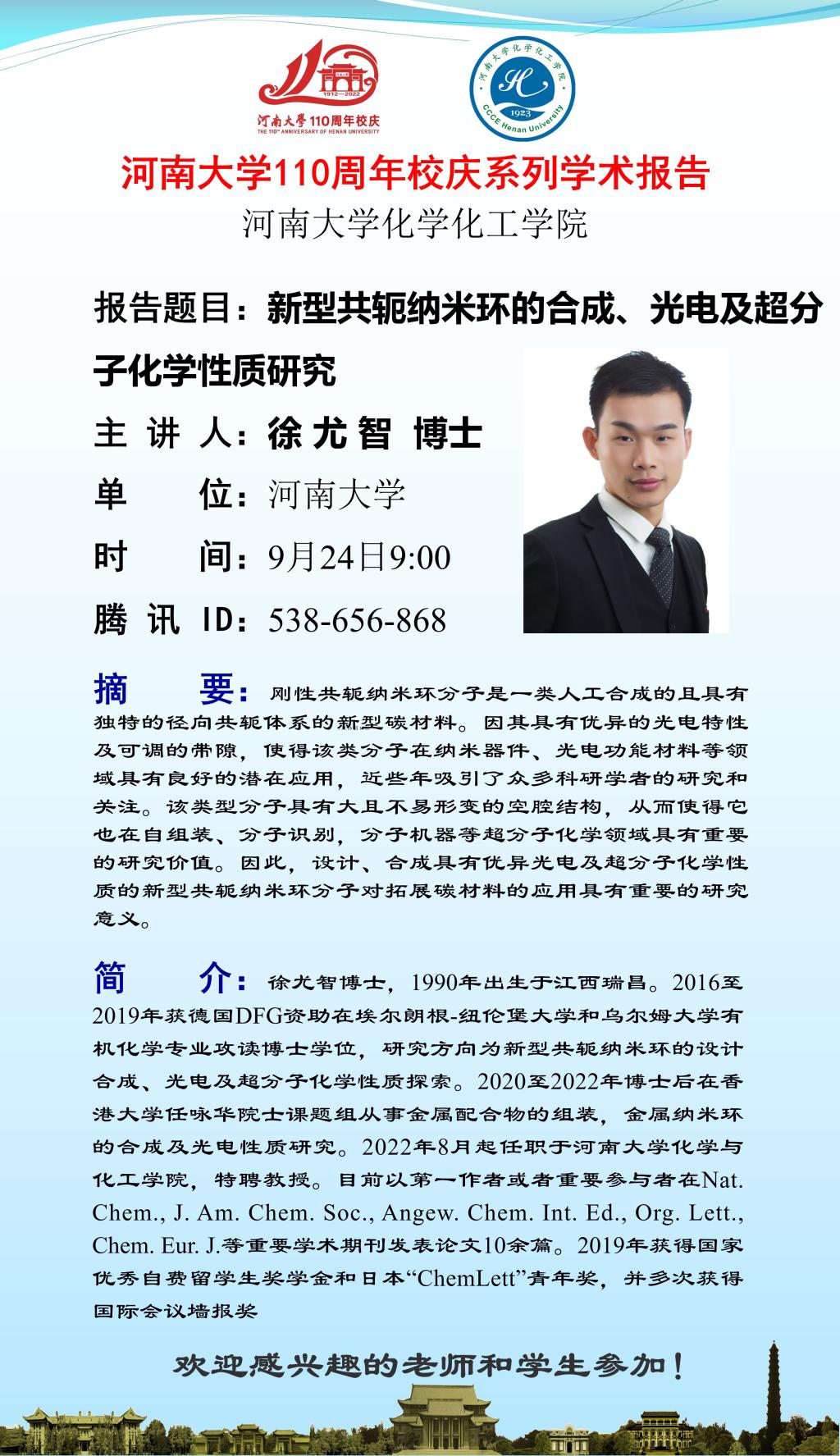 校庆学术活动:徐尤智:新型共轭纳米环的合成、光电及超分子化学性质研究(时间9.24)